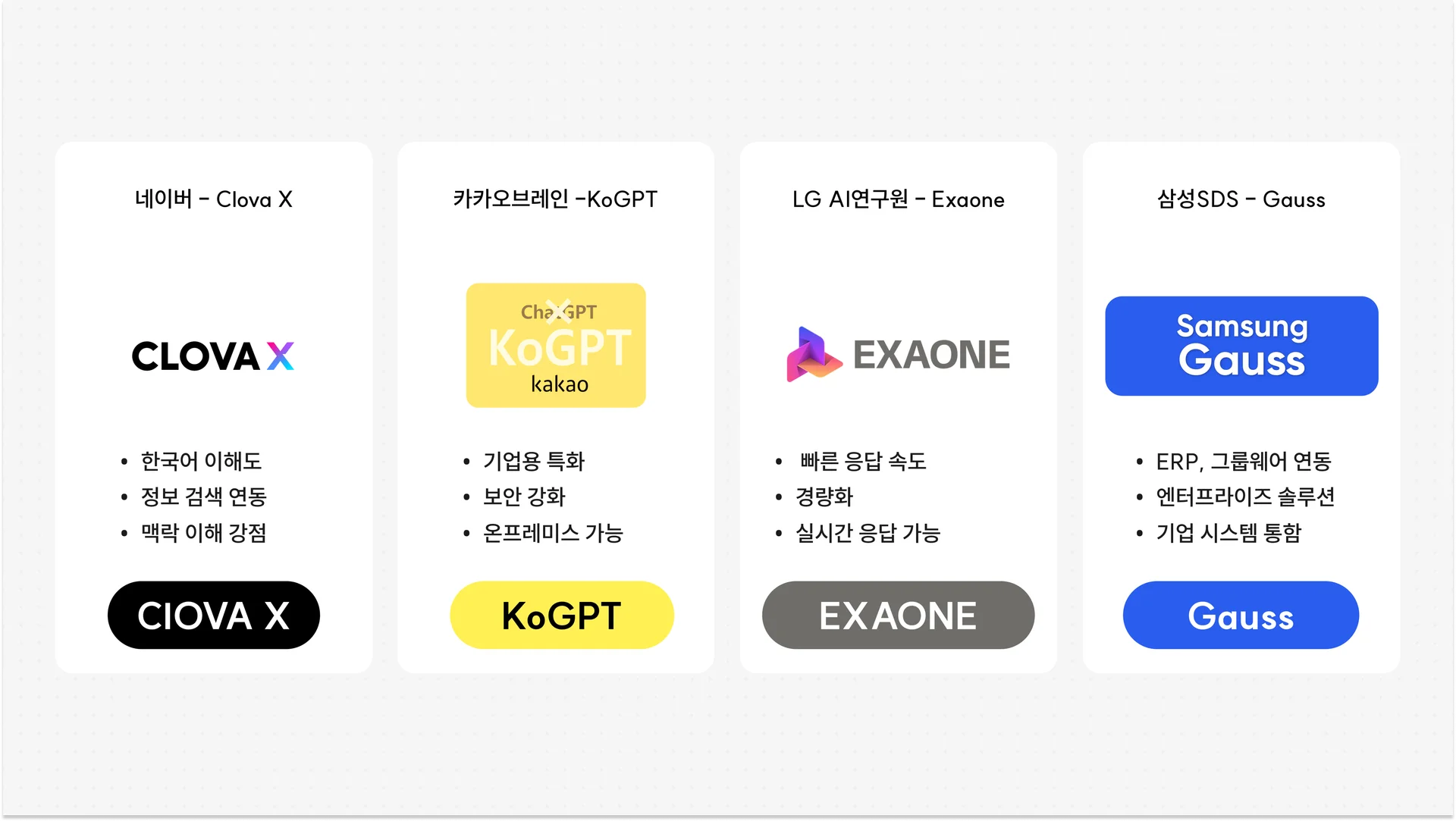 Exaone | LG AI연구원 | 기업용 특화, 보안 강화, 온프레미스 가능 | 금융·공공·대기업 내부 시스템 |