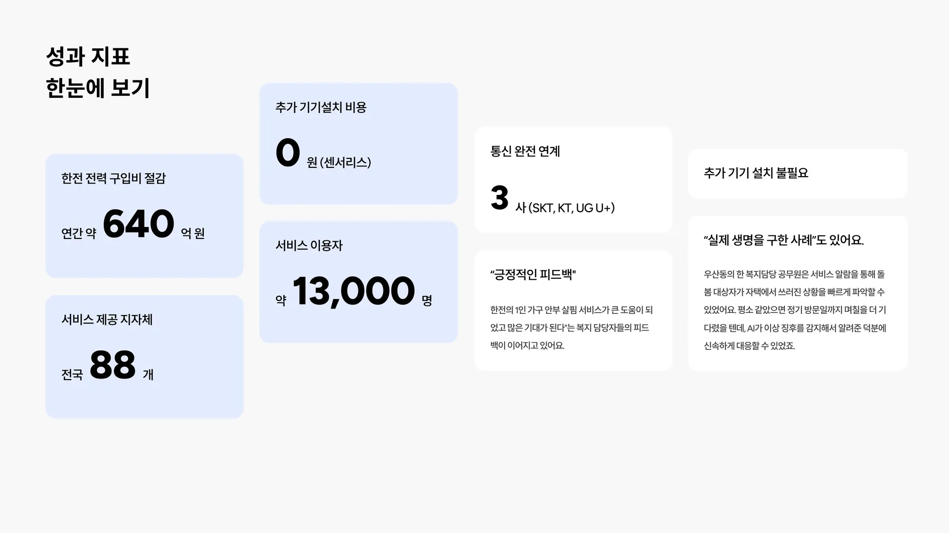 이 서비스가 보여주는 건, 에너지 기업이 가진 데이터가 전혀 다른 영역의 사회 문제를 해결할 수 있다는 거예요. 전력 사용량 데이터는 원래 요금 청구용이었지만, 관점을 바꾸니 지역사회와 생명을 지키는 인프라가 됐어요.