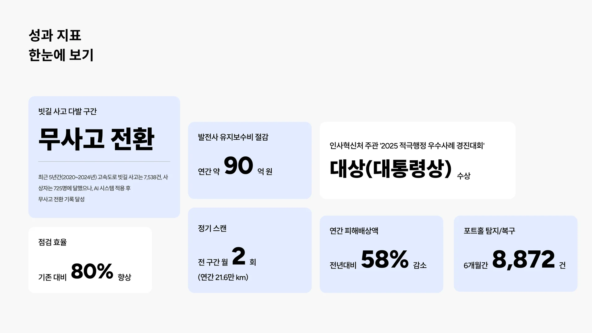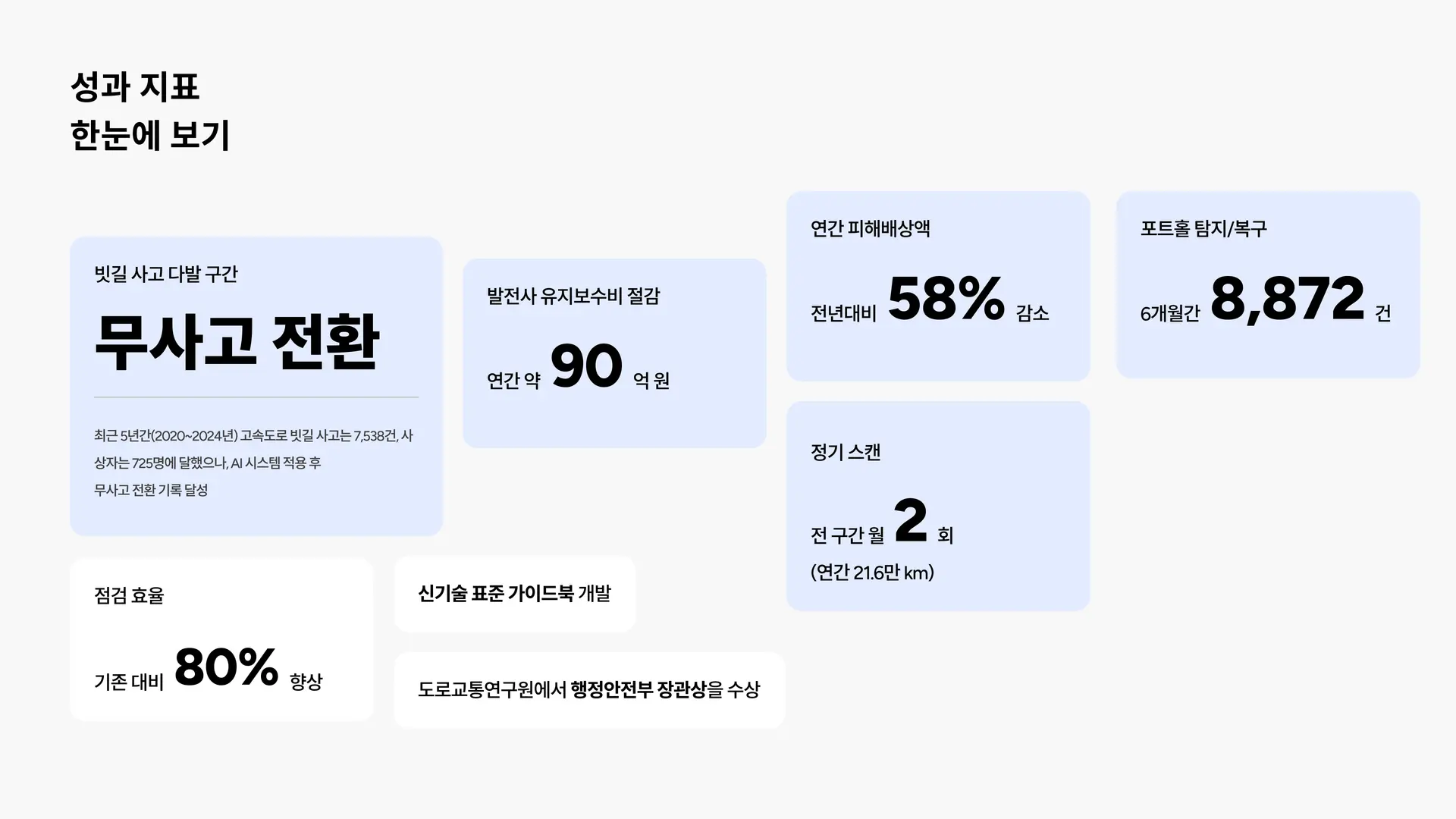 AI 시스템 도입 후 가장 눈에 띄는 변화는 빗길 사고 다발 구간의 무사고 전환이에요. 3년간 8건의 사고가 발생하던 위험 구간에서 3D 분석으로 물고임·배수불량 원인을 찾아 제거한 결과, 사고가 완전히 사라졌어요.