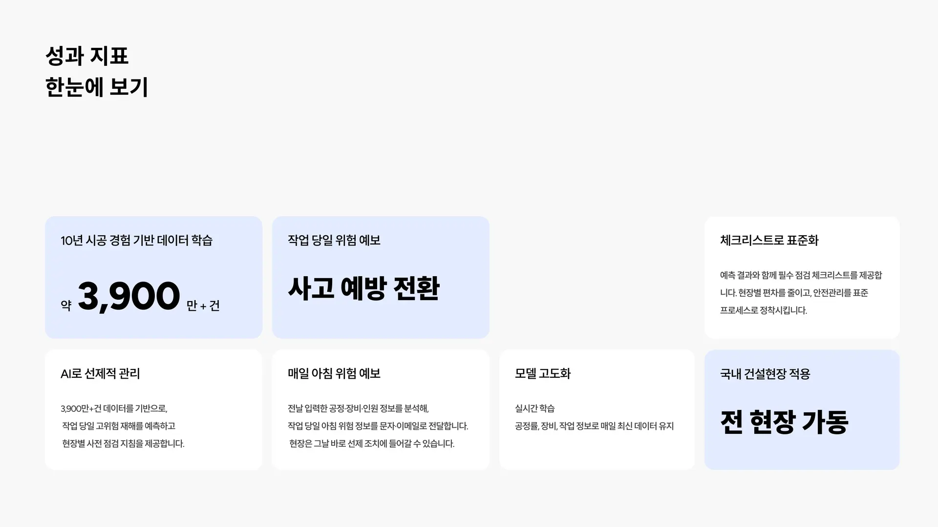전국 현장에서 매일 업데이트되는 공사 정보를 실시간으로 학습해요. 새로운 공법이 도입되거나, 계절에 따라 위험 요인이 달라지면 AI도 함께 학습해서 예측 정확도를 높여가요.