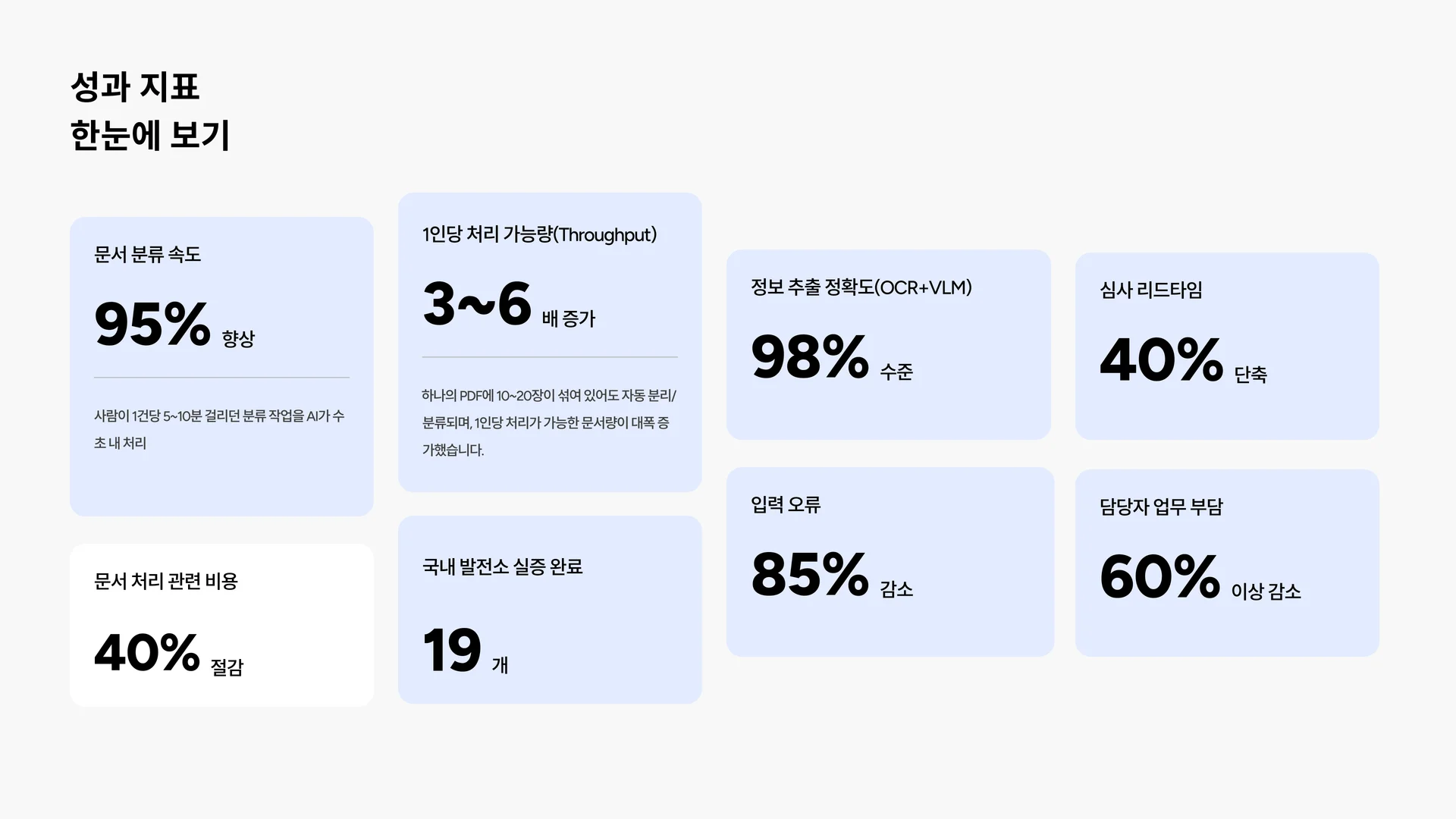가장 큰 변화는 담당자들이 "서류 읽는 일"에서 "판단하는 일"로 업무 중심이 옮겨갔다는 거예요. AI가 정보를 추출해 주니까, 사람은 그 정보를 바탕으로 심사 판단에 집중할 수 있게 됐어요.