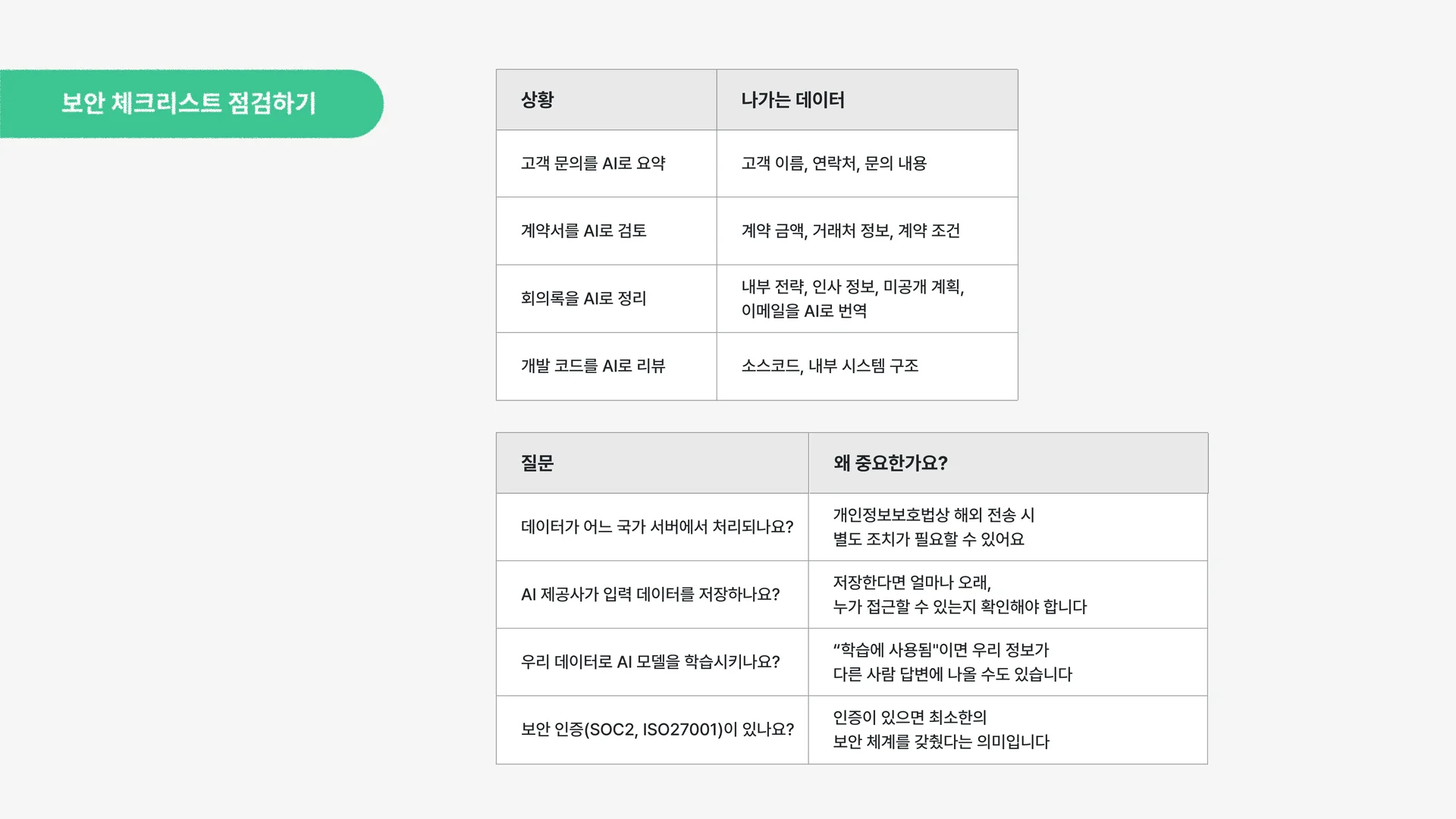 AI 제공사가 입력 데이터를 저장하나요? | 저장한다면 얼마나 오래, 누가 접근할 수 있는지 확인해야 해요 |