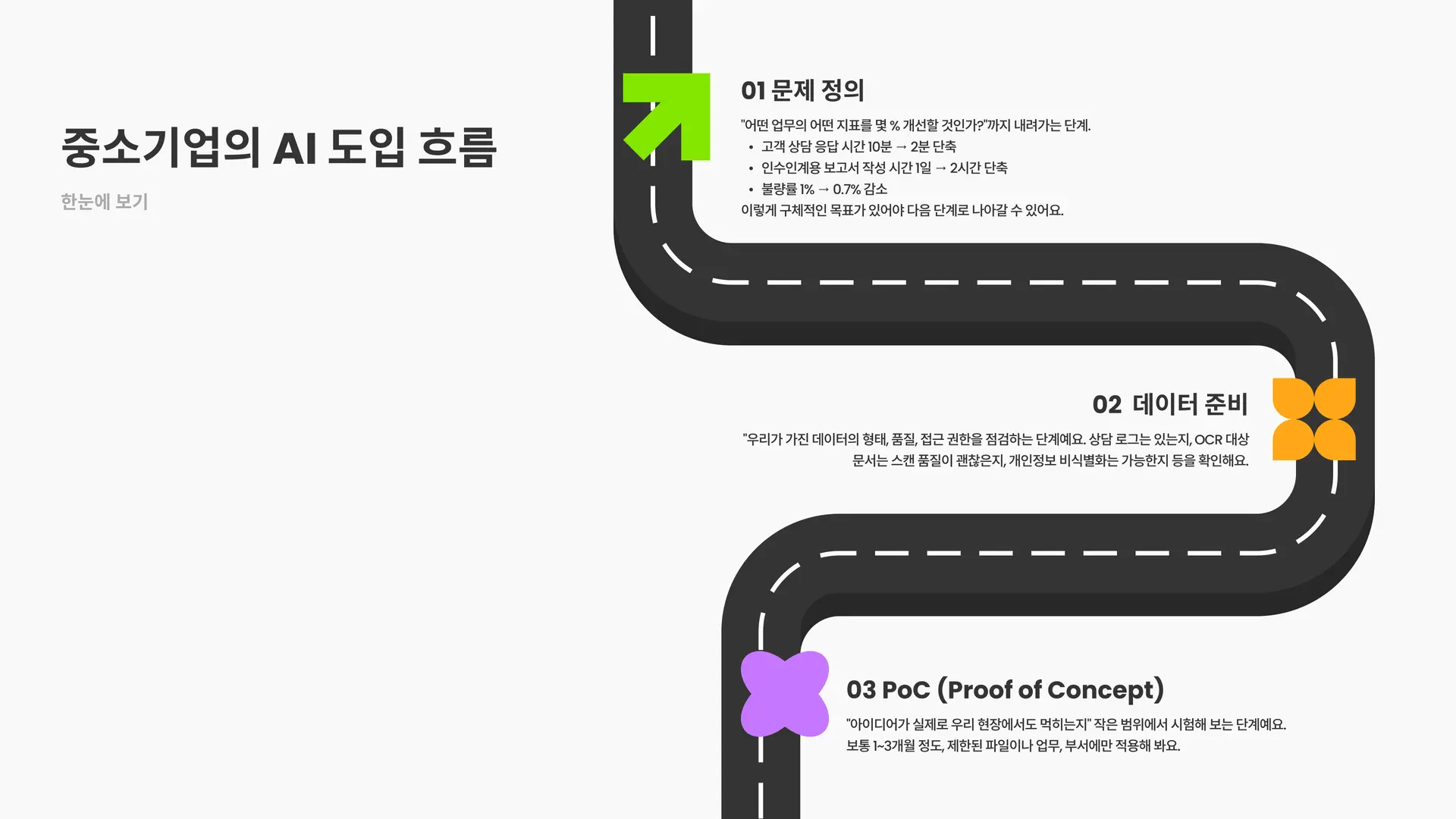 이번 편에서는 중소기업이 실제로 AI를 도입할 때 필요한 전 과정을 A~Z까지 한 번에 훑어봤어요.