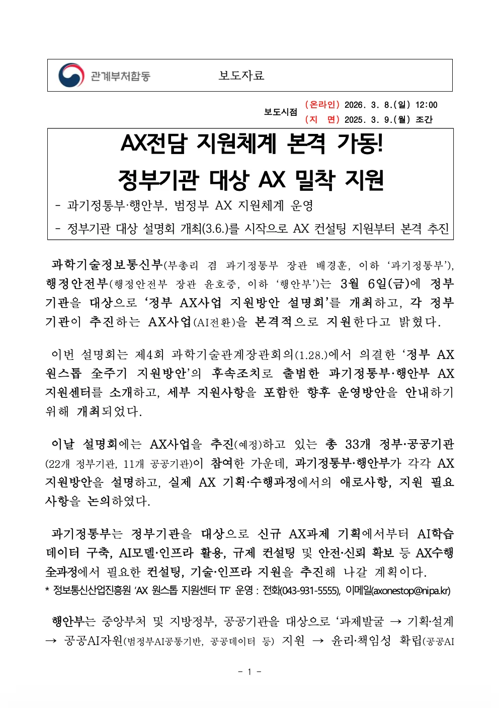 과학기술정보통신부와 행정안전부가 정부기관의 AI 전환을 지원하기 위한 AX 전담 지원체계를 본격 가동합니다. 양 부처는 3월 6일 정부기관 대상 설명회를 열고, 각 기관이 추진하는 AX 사업을 체계적으로 지원하겠다고 밝혔습니다.